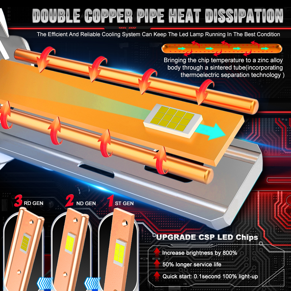 Dual copper tubes provide fast, stable heat dissipation to maintain brightness and extend bulb lifespan..