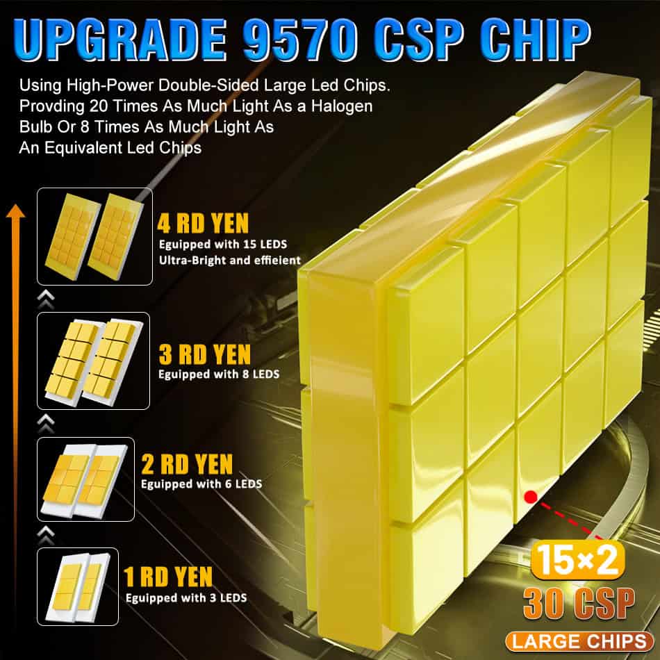 30×2 CSP chips deliver 800% higher brightness with balanced, uniform light output.