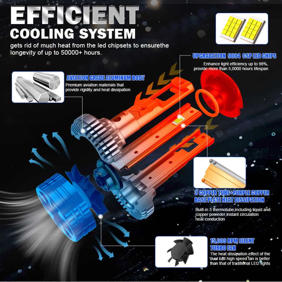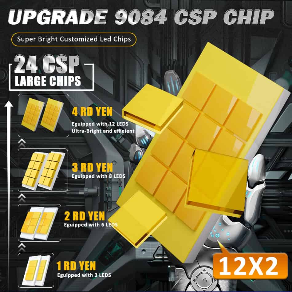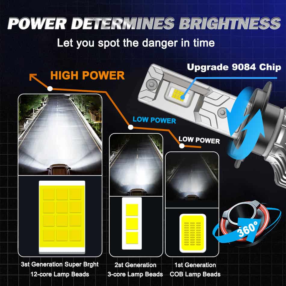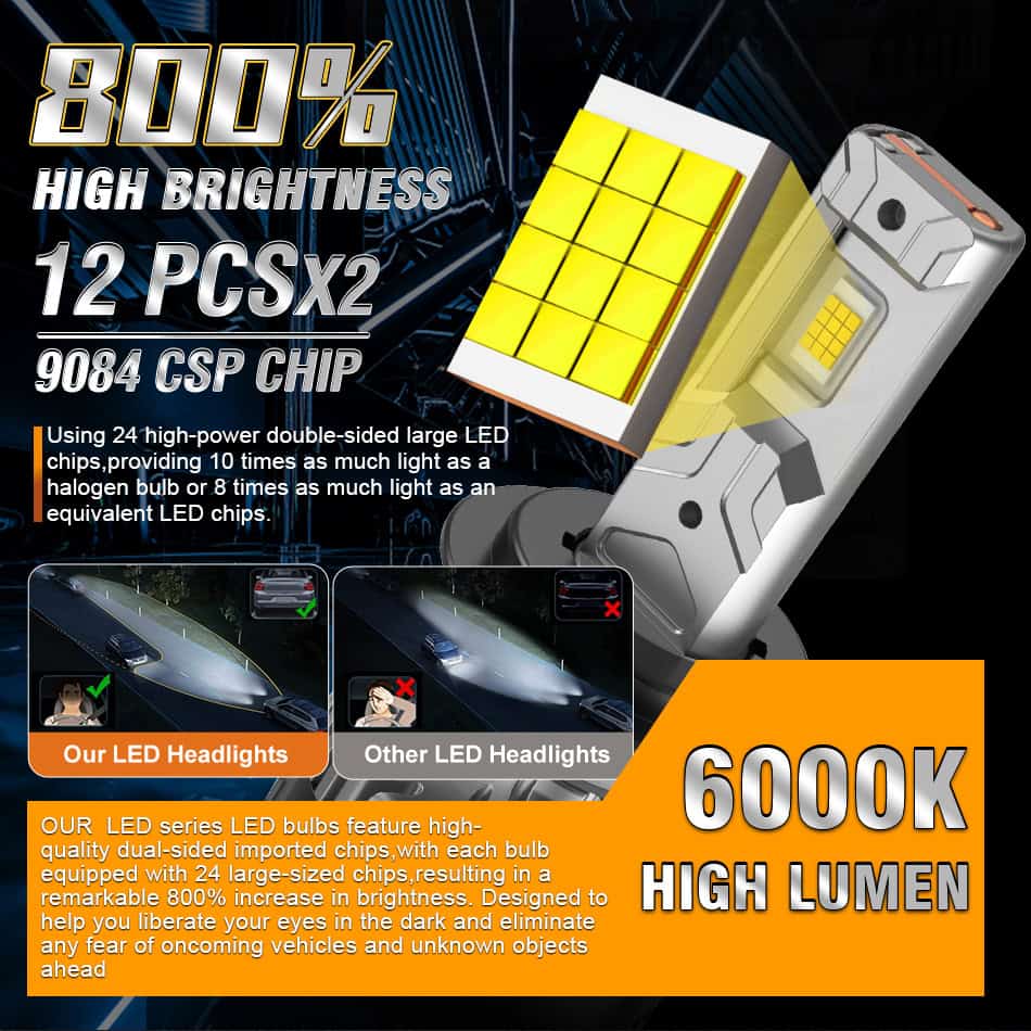 Built with 12pcs advanced 9084 CSP chips, our bulbs deliver up to 800% more brightness than halogen making the H4 headlight bulb LED the ultimate upgrade for clearer, safer night driving.